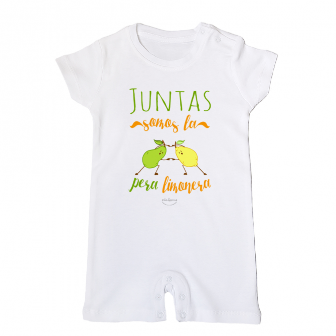 ¡Que tiemble el mundo! Aquí vienen las hermanas pera y limonera para formar el conjunto “Peralimonera”. Con este mono personalizado de diferentes colores para bebés tan divertido las niñas podrán ir informando de lo divertidas que son por separado, pero juntas son la bomba. El original mono con la frase “Juntas somos la peralimonera” es perfecta para ese par de hermanas que son un terremoto de dulzura y cariño.
